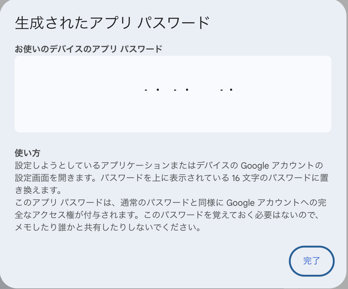 パスワードが発行されました。画面を閉じるとパスワードが見れなくなるのでメモしておきます。